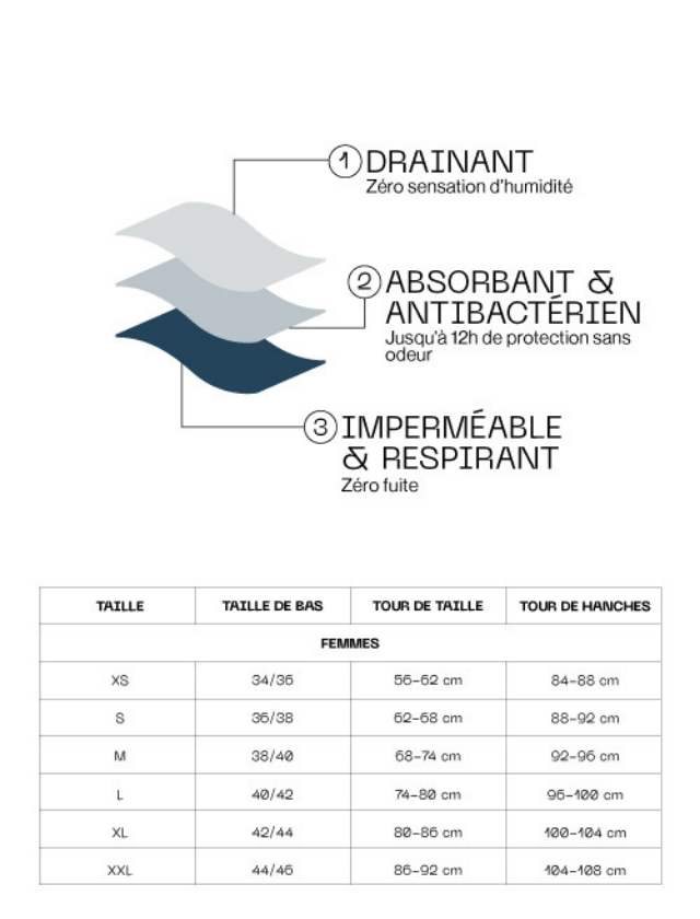 La technologie de la culotte menstruelle invisible Séléné coton est composée de 3 matières techniques ultra performantes aux propriétés spécifiques : une première matière drainante, une deuxième absorbante, et enfin une membrane imperméable mais respirante.
